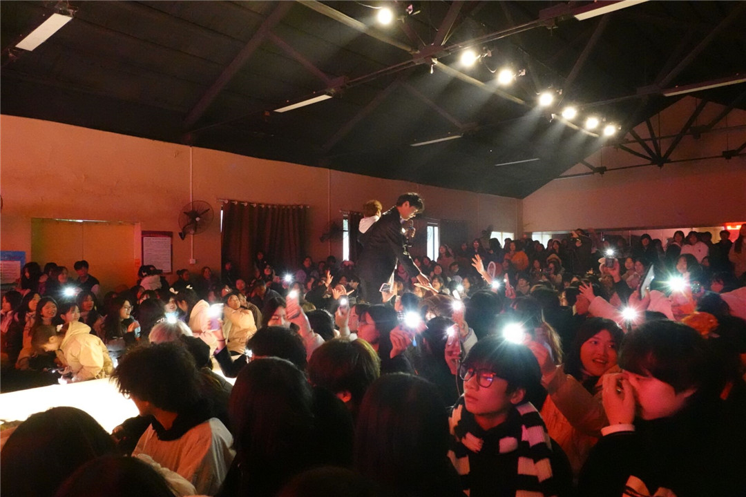 大禮堂里燈光璀璨、音樂回蕩,舞臺上和觀眾席的同學們上下聯動,群情激昂、熱鬧非凡。